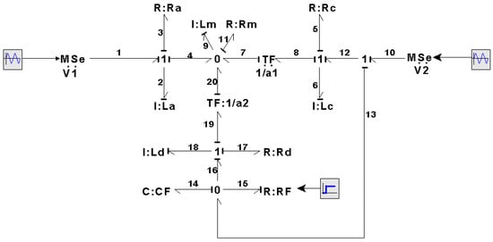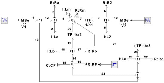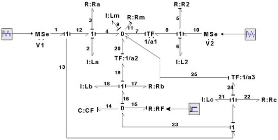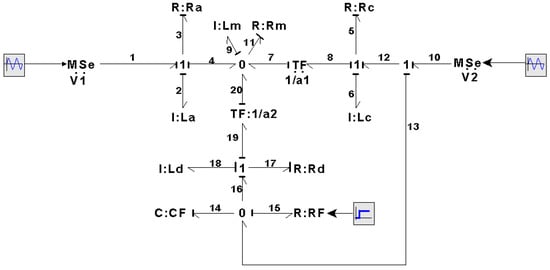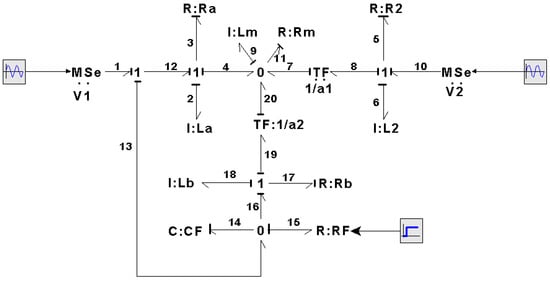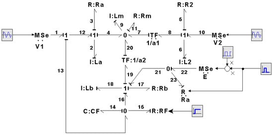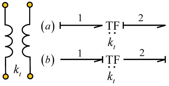 A non-linear transformer model using a bond graph approach to understand the energy exchanges in a traction chain and perform parameter identification was studied in []. A method for converting electrical circuits to their bond graph equivalent for modeling and simulation in SPICE was proposed in []. The use of bond graphs as tools in control theory for mechatronics students and for the design of a PID controller was discussed in []. A bond graph model representing a virtual model of the mechanical and hydraulic interconnections in Rough-Terrain Variable Reach Trucks was presented in []. The fault diagnosis of a three-phase induction motor using a bond graph and a time causal graph was proposed in []. A dynamic model of an isolator was obtained from the associated bond graph, and the energy transfer characteristics were found in [].