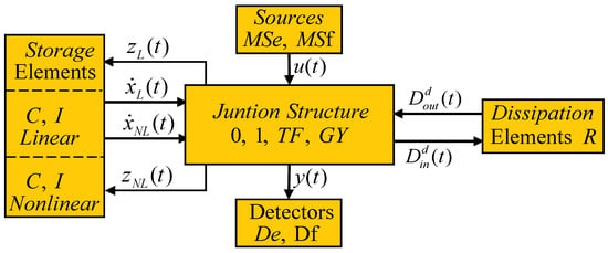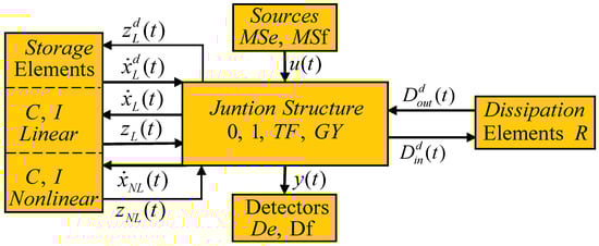 The bond graph methodology was introduced by Paynter in 1961. Subsequently, researchers such as Karnopp, Rosenberg, Thoma, Brown, and Breeveld have published numerous advances in papers and books that comprise the state of the art regarding the modeling and application of bond graphs. A bond graph determines the formal and unified procedures in the modeling of dynamic physical systems. One of the main characteristics of a bond graph is the ability to analyze the exchange of power between its elements. This unified character allows for the modeling of systems comprising several energy domains (electrical, mechanical, hydraulic, magnetic, thermal). Likewise, the structural properties of systems—such as their stability, observability, controllability, and steady-states—can be derived almost directly from systems modeled as bond graphs. In addition, bond graphs have been extended for control design activities. To date, bond graph modeling has been widely used to obtain new procedures for the structural analysis of systems [], model reduction [,], as well as the development of system modeling software []. Systems modeled using bond graphs can be linear or non-linear, and time-variant or time-invariant. Essential references on modeling with and the properties of bond graphs include [,,]. However, recent advances in bond graph theory comprise various directions, as detailed below.
