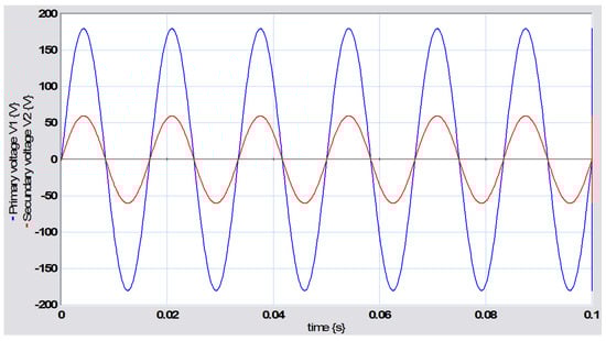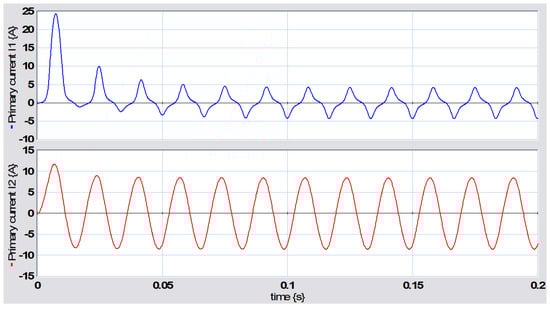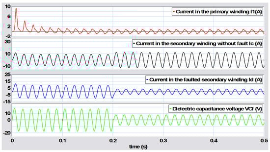 The behavior of the transformer when a fault occurs in the primary winding between turns is shown in Figure 38, with the failure occurring at a time of s. Note that the currents in the three sections into which the primary winding has been divided change in magnitude, indicating that a fault has occurred. This fault is located at the end of the number of turns of and extends up to , while the rest of the winding is . The parameters for this fault are , , , mH, mH, and mH. The presence of this fault over a short period of time is illustrated in more detail in Figure 39.