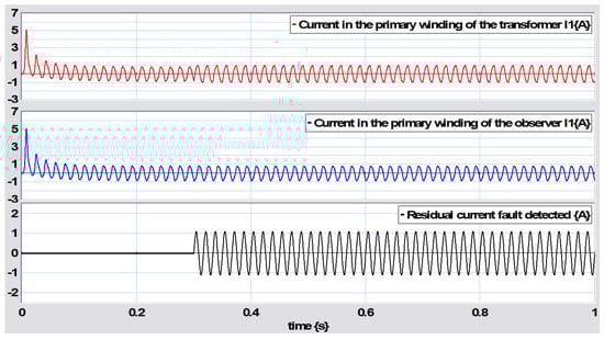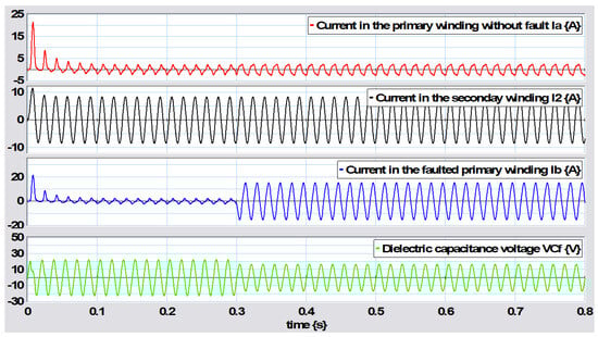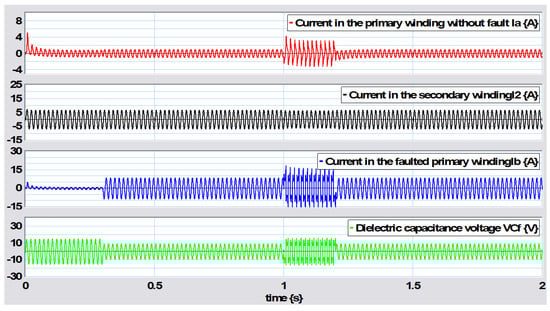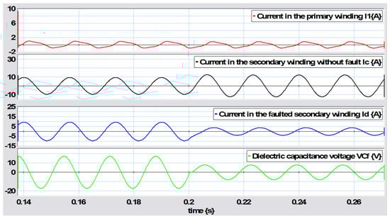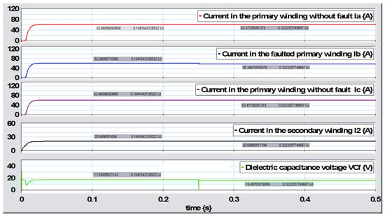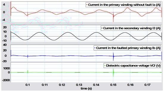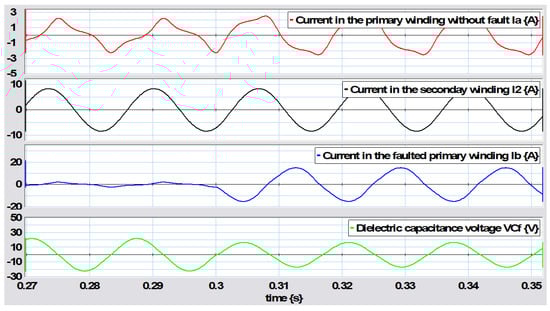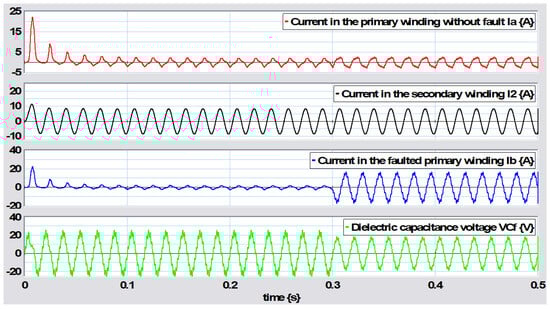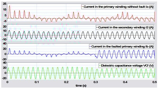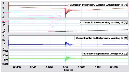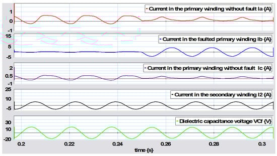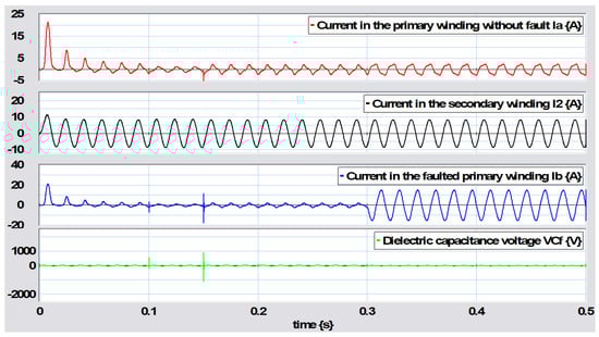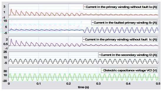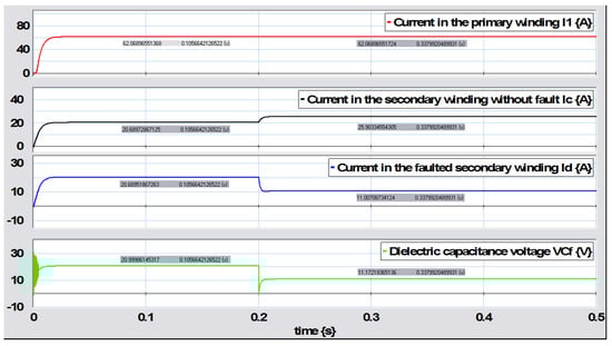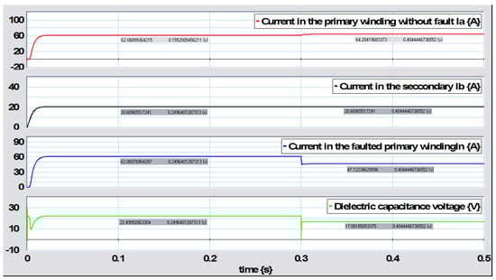 The behavior of the transformer in the case of an inter-turn fault in the primary winding in its steady-state is shown in Figure 40. It can be noted that the current in the section of the primary winding where the fault is located changes, indicating the presence of the fault.