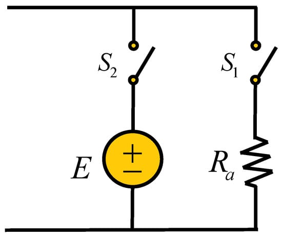 The voltage E is a random square wave, and the arc voltage is usually flap-topped. The switches and control the burning and extinction period of an arc, respectively. When arcing is in the burning period, is closed and is open. In the extinction period, is closed and is open. The resistance is a high value.