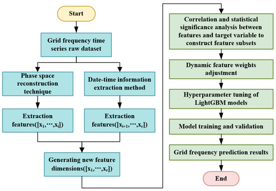 This section outlines the framework of the prediction method based on the fusion of Dynamic Significance–Correlation Weighting (D-SCW) and the LightGBM model. First, the phase space reconstruction technique and date–time information extraction method are used to expand the features of the original grid frequency time series dataset, and multidimensional features are generated to construct the time series prediction model; second, the correlation strength between the newly generated feature sequences is calculated based on the Spearman’s rank correlation coefficient method, and the statistical significance level (p-value) of the features is evaluated to form the two-dimensional features. Then, the criteria are screened to construct a feature subset; again, a dynamic feature weight adjustment mechanism is introduced to dynamically respond to the time-varying fluctuation characteristics of the grid frequency. Finally, the LightGBM model is hyperparameter-tuned and trained. Figure 1 demonstrates the technical route of the proposed D-SCW-LightGBM fusion framework in grid frequency prediction.