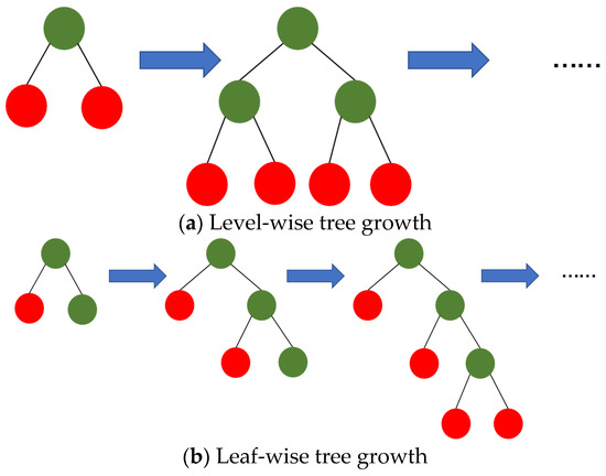 LightGBM aims to improve the training efficiency and model performance of GBDT. Its core lies in combining the Gradient-based One-Side Sampling (GOSS) strategy, which prioritizes the selection of the most representative high-gradient instances from the samples to improve the information utilization rate during the training process; at the same time, the continuous features are discretized by the histogram-based algorithm, which effectively reduces the computational and memory overheads. In addition, LightGBM adopts a leaf-based growth strategy for tree structure optimization, enabling the model better to capture the complex distribution features of the data, thus further improving the prediction accuracy. Figure 2 demonstrates the two strategies of hierarchical growth and leaf growth, where green nodes represent decision nodes and red nodes denote leaf nodes.