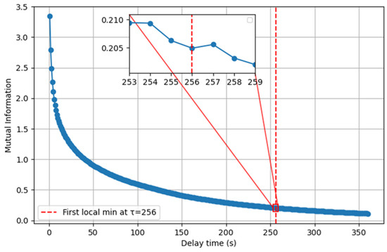 From Figure 3, it can be seen that with the increase in delay time, τ, the mutual information value between the original sequence and the delayed sequence decreases rapidly, which indicates that the information redundancy between the data points is gradually reduced and the correlation is weakened. When τ is small, the mutual information value is high, reflecting a high degree of correlation between the sequences, which easily leads to excessive redundant information in phase space reconstruction, and is not conducive to the presentation of the system’s dynamic features. As τ increases, the mutual information value gradually decreases, and the information independence increases, which helps to enrich the phase space structure. The red dashed line marked at τ = 256 in the figure is the first local minimum of the mutual information curve, so it is selected as the optimal delay time and verified by the local zoom-in diagram. The suitable delay time reduces the redundant information in the reconstruction and preserves the system’s dynamics. Based on the phase space reconstruction theory and mutual information analysis, τ = 256 is finally determined to be the optimal delay time for the subsequent dynamics analysis and predictive modeling.