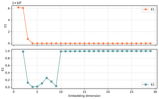 where N denotes the total length of the original time series, and N-mτ constructs the available number of phase space vectors. When the E1(m) curve gradually converges to a specific stable value, it indicates that the system structure will not undergo a new change if it continues to expand to higher dimensions based on this embedding dimension. Then, the embedding dimension can fully characterize the system’s dynamics at this point, and there is no need to increase the number of dimensions further to increase the complexity of the analysis.