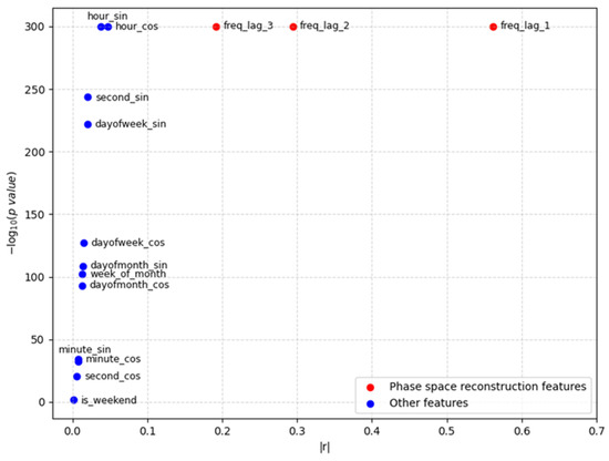 In this paper, the correlation between the features extracted based on phase space reconstruction and date–time information and the grid frequency is further analyzed and demonstrated by a scatter plot in Figure 5. Here, the horizontal axis represents the absolute value of Spearman’s correlation coefficient (|r|) between each feature and the grid frequency, and the vertical coordinate is its corresponding significance level, which is quantified by −log10 (p value) to reveal the degree of correlation and statistical significance of each feature with the target variable.