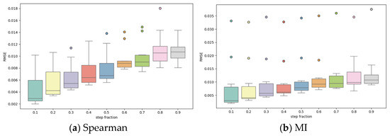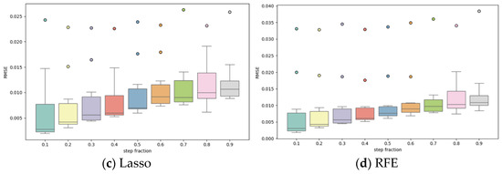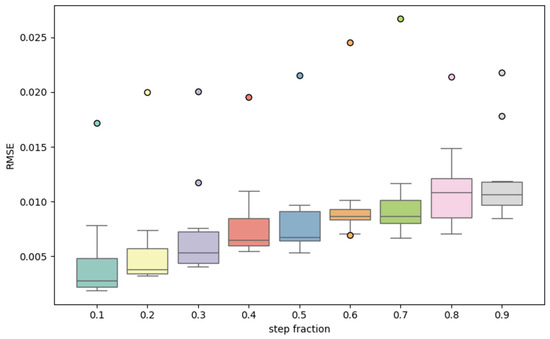 According to the results in Figure 6 and Figure 7, the effect of the step ratio on the model RMSE is more significant. The box plots in Figure 6 show that the RMSE shows an overall upward trend with the increase in the step size ratio, indicating that a smaller step size ratio helps to improve the model prediction accuracy. When the step size ratio is larger, the prediction error and volatility of the model increase significantly, and the outliers of some distributions tend to increase, indicating that a step size ratio that is too large is not conducive to model stability. Combined with the three-dimensional scatter plot analysis in Figure 7, the combination of different sliding window lengths and step size ratios has an obvious relationship with the effect of RMSE. Overall, the smaller step ratio and longer sliding window length exhibit lower RMSE values, indicating that the simultaneous optimization of these two hyperparameters can effectively improve the model performance.