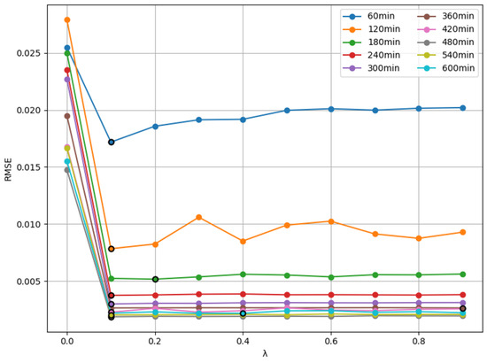 As can be seen from the figure, the RMSE of the model decreases significantly when λ is gradually increased to 0.1. Subsequently, it tends to stabilize under most of the sliding window lengths. This phenomenon suggests that the appropriate fusion of historical feature weights helps improve the model’s generalization ability. Further analysis shows that, in the case of shorter sliding windows (e.g., 60 min, 120 min), the RMSE value of the model is more sensitive to changes in λ. In the case of longer sliding windows, the value of RMSE is at a lower level and relatively less affected by the change in λ. Some of the data points in the figure are labeled with circles with black outlines, representing the best λ parameter points under different sliding window lengths. Overall, a reasonable setting of the λ value can effectively reduce the prediction error, and there is a certain degree of difference in the value of λ to optimize the model performance under the conditions of different lengths of the sliding window.
