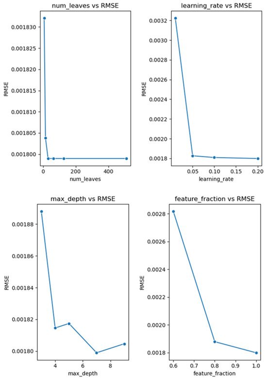 Figure 9 illustrates the effect of the four core hyperparameters on the model’s RMSE on the validation set, and Table 1 lists the optimized LightGBM model hyperparameter configurations.