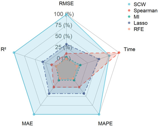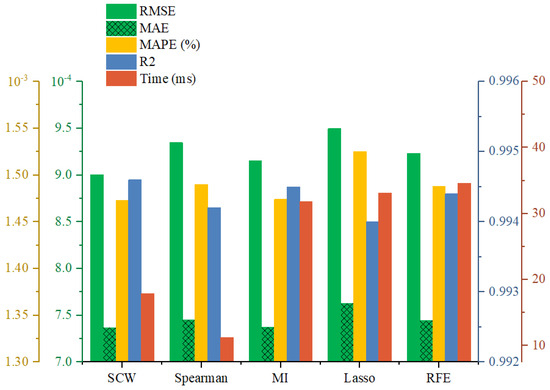 According to the quantitative evaluation results in Table 4, the SCW method proposed in this paper shows a significant advantage in the regression task, with a low RMSE value of 1.799 × 10−3, an R2 as high as 0.9924, and better indicators such as MAE and MAPE than the other methods. In this table, the downward arrows indicate that a smaller value means better regression performance for that metric, while the upward arrow for R2 means that a larger value is preferable. While the Spearman and Lasso methods show good fitting capabilities, their overall regression performance is slightly inferior to SCW. The MI and RFE methods have increased model complexity due to higher feature dimensions, and the weight calculation time consumed is 32.82 ms and 34.70 ms, respectively. Combined with the radar charts in Figure 12, the SCW method has a balanced and outstanding performance in the core indexes such as R2 and RMSE; the Spearman method has an advantage in calculation time consumed, but the performance of the other indexes is average; the MI and RFE have minimal differences in error metrics such as MAE and MAPE, and their regression accuracy is comparable. Overall, the SCW method not only improves model accuracy but also enhances computational efficiency by effectively controlling the feature dimensions, which verifies its feasibility and value in engineering applications.