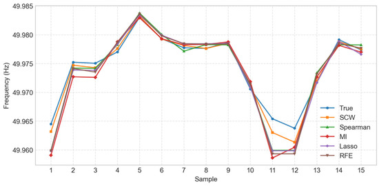 According to the results in Table 7, the differences between the feature selection methods on the RMSE and MAE metrics are small, and the overall error is low. Among them, the SCW method performs optimally on these two error indicators. The performance of the methods on the MAPE indicator is relatively close, and the R2 values of all methods are higher than 0.994, indicating that the model has good interpretability. However, there are obvious differences in the efficiency of feature weight computation: the Spearman method has the shortest weight computation time of 11.22 ms, while the RFE and Lasso methods have relatively longer weight computation times of more than 30 ms. Figure 15 further verifies the above conclusions through the visualization comparison. It can be seen that the SCW method outperforms the other methods in terms of prediction accuracy (RMSE, MAE) and the degree of model fit (R2), and although the weight calculation time is slightly higher than that of the Spearman method, it is much lower than that of the algorithms such as MI and RFE. In addition, the Spearman method makes its MAPE slightly higher than that of SCW due to the screening of features based on correlation only, further validating the importance of statistical significance testing. In summary, the SCW method balances prediction accuracy and computational efficiency in the grid frequency prediction task by integrating correlation analysis and a statistical significance test.