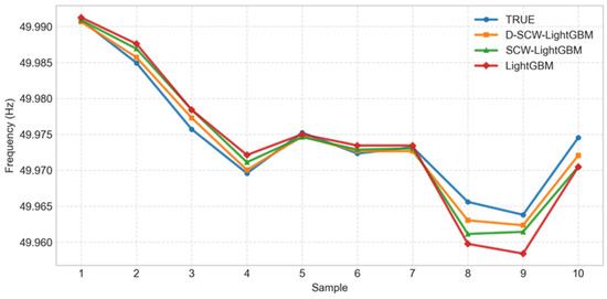 In order to further evaluate the impact of different feature weight allocation strategies on the LightGBM model in grid frequency timing prediction. In this paper, three feature input methods are designed: unweighted input (LightGBM), static weight assignment (SCW-LightGBM), and dynamic weight assignment (D-SCW-LightGBM). All three methods are compared and experimented upon with the same dataset and training process. Table 5 presents the results of the three methods on the key regression metrics (RMSE, MAE, MAPE). Figure 14 then presents the fitting effect of the predicted sequences of each method to the real sequences on the validation set.