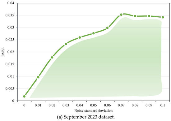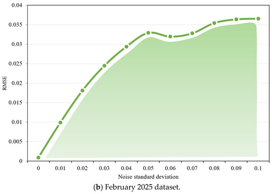 To systematically evaluate the proposed method’s resistance to input perturbations, this study conducted noise sensitivity tests on the two aforementioned datasets. By incrementally adding Gaussian noise with different standard deviations to the validation set, the RMSE of the model’s predictions was recorded under each scenario. The noise–error relationship curves are shown in Figure 16, and key statistical indicators are summarized in Table 8.
