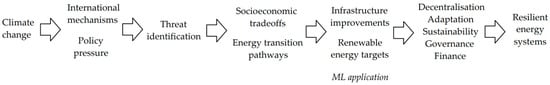 A key research gap lies in the limited availability of high-quality, real-time data needed to train ML models for accurate energy forecasting and grid optimization. Many ML models are not generalizable across geographies and energy systems, making them less effective in global climate change adaptation contexts [30]. There is a lack of sufficient research on interpretable and transparent ML models, which hinders trust and adoption in critical infrastructure sectors such as energy [31]. The integration of climate science and ML is still in its infancy, resulting in models that may not adequately account for long-term climate variability or extreme events [32]. Scientific collaboration among energy engineers, data scientists, and climate experts is often fragmented, limiting holistic solutions [33]. On the economic front, there is a lack of cost-effective models for implementing ML, especially in low-income regions and small utilities that face infrastructure and financial constraints [34]. The return on investment (ROI) of ML-based solutions for renewable energy integration is often uncertain, discouraging private sector involvement. Economic policies and energy markets are not yet designed to encourage ML-based optimizations, creating regulatory bottlenecks [35]. The upfront costs of digital infrastructure (sensors, edge devices, and data platforms) are a barrier to widespread adoption of ML in renewable systems [36,37]. There is a significant digital literacy gap in society, particularly in rural and developing areas, which limits the ability of the workforce to engage in ML-enabled energy systems [38]. Public awareness of the role of ML in climate change adaptation is low, reducing public support and funding for related innovation [39]. Privacy and data security concerns related to energy consumption data can reduce willingness to share or use data in ML applications [40]. Communities may resist ML-based automation due to fears of job losses in traditional energy sectors [41]. Biases in ML models, if not addressed, can lead to the unequal distribution of energy resources or adaptation benefits across different social groups [42]. There is a need for inclusive policy frameworks that ensure that ML solutions for renewable energy and climate change adaptation are fair, transparent, and community-based (Figure 2) [43,44].