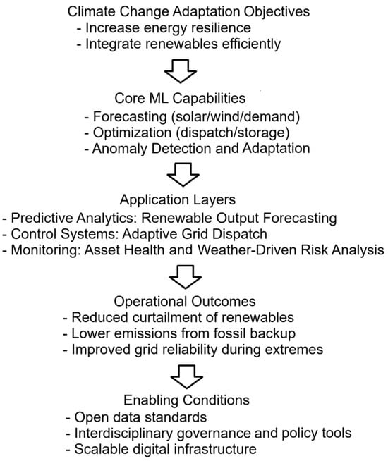 This review highlights that the use of ML goes beyond the automation of energy generation and distribution systems—it represents a qualitative change in the way energy systems can adapt, learn, and evolve in sync with climate threats. The novelty and contribution lie in demonstrating large-scale operability, precision under uncertainty, and the ability to transform real-time data into continuous adaptation, which distinguish ML as a fundamental enabler of next-generation climate strategies. Unlike conventional approaches, ML can process vast amounts of heterogeneous data—such as weather inputs from satellites, network sensor data, and consumer demand patterns—to generate real-time adaptive insights. The combination of strategic, operational, and regional/local levels involves leveraging edge computing and federated learning to provide ML with the ability to continuously learn and self-update with new data, which is critical for operating in rapidly changing climate and energy environments. This includes reducing forecast lead times and accuracy for variable energy sources, directly reducing the need for fossil fuel-based reserves, and minimizing energy constraints. ML enables rapid, local adaptation necessary for climate resilience where conditions vary regionally and are subject to unpredictable fluctuations (e.g., sudden local cloud cover).