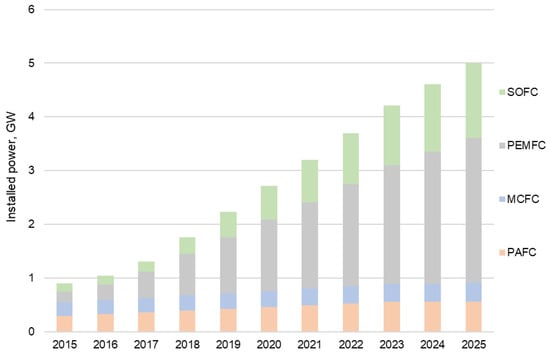 Total installed capacity of large-scale (>100 kW) stationary fuel cells across the world [5,6,7,8,9,10].