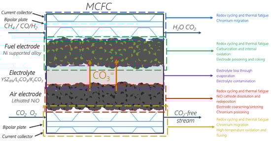 A summary of primary degradation mechanisms occurring at different components and interfaces within the MCFC cell is presented in Figure 3.