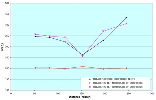 Impact of carburization on the hardness of the Ni/AISI 310S/Ni trilayer under anodic conditions [35]. Reproduced with permission from [35]. Elsevier, 2005.