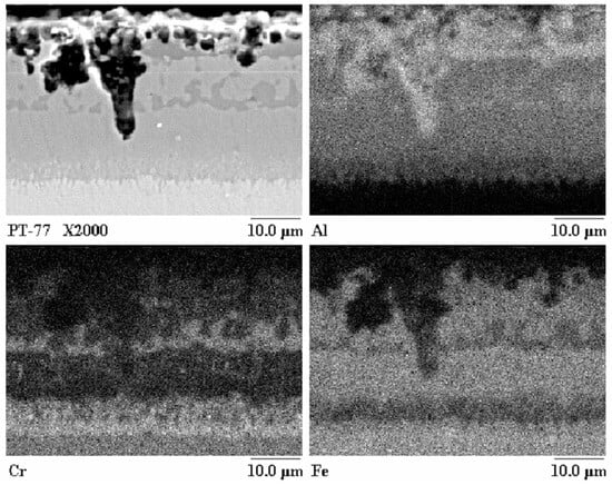 SEM cross-section of Al-slurry coating after diffusion treatment and 1000 h in molten carbonate, showing partial crevice formation and LiAlO2 protection [49]. Reproduced with permission from [49]. Elsevier, 2002.