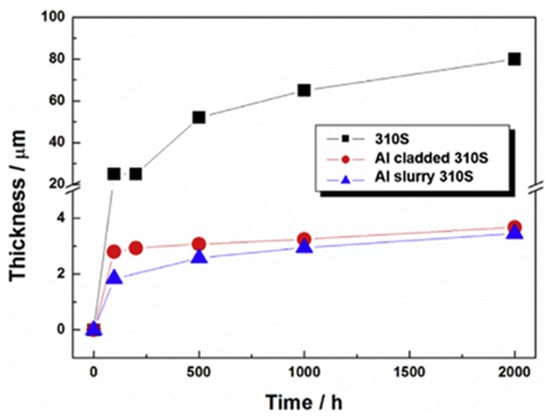 Oxide layer thicknesses of uncoated 310S, Al-slurry-coated 310S, and Al-cladded 310S as a function of immersion time [40]. Reproduced with permission from [40]. Elsevier, 2018.