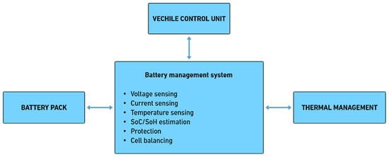The safety and proper operation of a lithium-ion battery pack made up of series-connected cells requires an advanced battery management system (BMS). The BMS monitors and controls various aspects of the battery, including cell voltages, temperatures, SOC, state-of-health (SOH), safety, data acquisition, and cell balancing, as exhibited in Figure 2 [25,26,27,28,29,30].