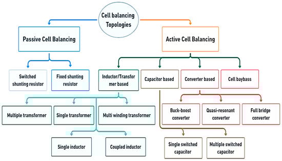 The various methods utilised in EV applications to achieve cell balancing in Li-ion battery systems are shown in Figure 3. Cell-balancing techniques can be roughly categorised as passive or active [50].
