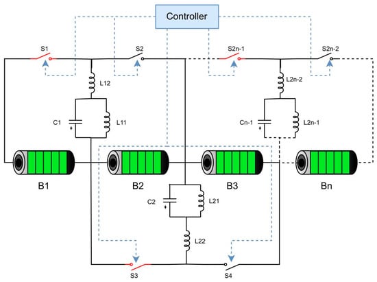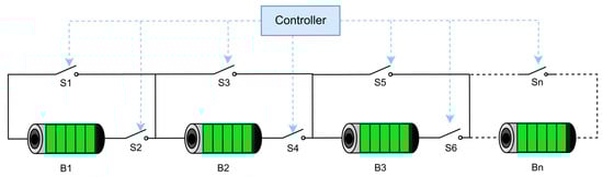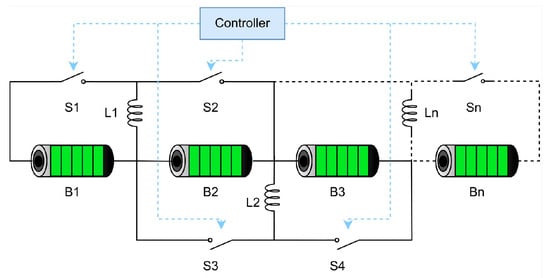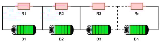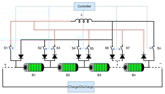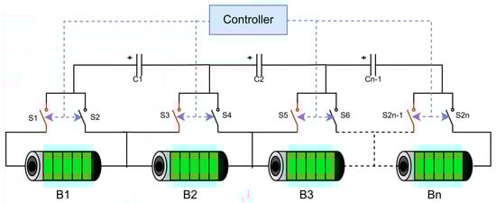 A classic circuit diagram for switched shunting resistor topology is shown in Figure 5, where switches (S1, S2, …, Sn) are connected in series with shunting resistors (R1, R2, …, Rn) and resistors are connected in parallel with cells (B1, B2, …, Bn). The simulation of the switched shunting resistor topology is presented in [56,58], and hardware implementation can be seen in [58].