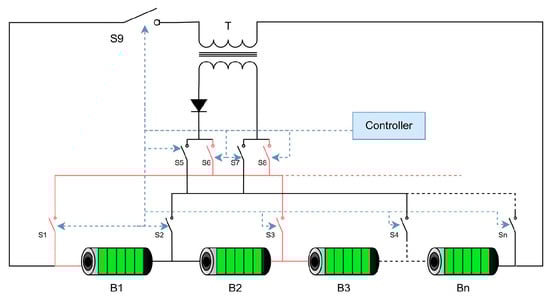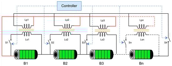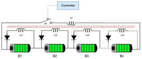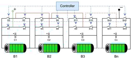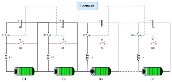 In the bypass cell balancing topology, as shown in Figure 16, each cell or module in the battery pack is connected to a pair of switches, presented in [86,87,88,89]. One switch is placed to operate in series with the other cells, and another switch is utilised to disconnect the series connection of the cells for a period set by the controller. Throughout the cell balancing process, the switches are managed based on the voltage levels of the individual cells. The maximum voltage cell in the pack is bypassed while it is charging, and the minimum voltage cell is bypassed while the discharge process is in progress.