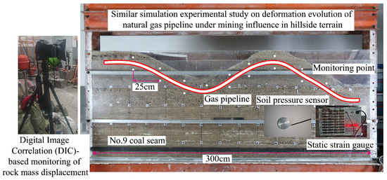 To investigate the impact of subsidence basins in mountainous terrain on gas pipeline deformation, a similarity simulation experiment was designed based on the geological conditions of the mining area where the pipeline is located. This experiment aims to simulate the deformation evolution of gas pipelines under mining-induced disturbances in slope terrain. The experimental system comprises three main components: a 3 m × 0.2 m × 1.4 m planar model frame serving as the simulation platform, a photographic monitoring system (including digital cameras, remote-controlled shooting systems, and fill lights) to visually document deformation processes, and a stress–strain acquisition system equipped with static resistance strain gauges, soil pressure cells, and strain gage rosettes to measure mechanical responses of the pipeline and surrounding soil. This setup enables detailed analysis of pipeline stress redistribution and failure mechanisms under dynamic subsidence conditions.
