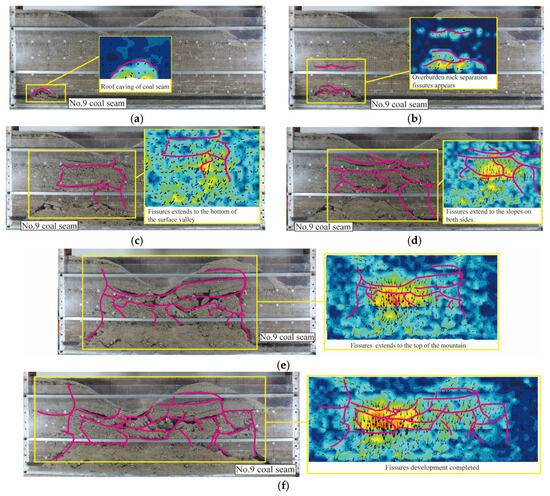 Image processing software was utilized to analyze images captured during the subsidence process. By tracking the coordinate changes in pixels before and after excavation, the movement of rock strata was evaluated. The image analysis covered a pixel range of 5000 × 1600, corresponding to a physical model area of 3 m × 1.2 m, with a 50-pixel spacing between measurement points. This monitoring revealed the progressive movement of rock strata from the coal seam to the surface and the associated surface damage at different stages of working face excavation, as illustrated in Figure 4.