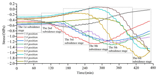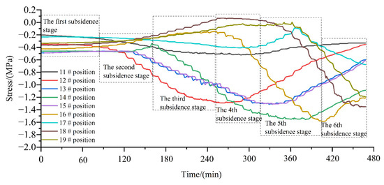 The stress evolution process of the soil measuring points on the upper part of the pipeline is shown in Figure 5. During the subsidence process, the soil pressure of each monitoring point on the upper part of the pipeline has different manifestations in different subsidence stages. Pressure cells 11 # and 17 # are located at the top of the mountain at the edge of the subsidence area. Due to the support of coal pillars and the influence of terrain, the stress changes little during the subsidence process. Pressure cell 14 # is located in the valley of the center of the subsidence area, where the earth pressure subsidence has a great influence. The soil stress continues to increase at the beginning of the second subsidence stage, and the stress reaches the maximum value of 1.6 MPa after reaching the fifth subsidence stage, and then rapidly decays to 1.1 MPa at the sixth subsidence stage. Pressure cells 12 #, 13 #, and 15 # are located in the middle of the mountain slope in the center of the subsidence basin, and the stress change trend is consistent. The stress reaches the maximum value of 1.4 MPa in the middle and late stages of subsidence, and then rapidly decays to about 0.5 MPa. Pressure cells 18 # and 19 # are located at the bottom of the valley at the edge of the subsidence basin. After the first four stages, the stress of the upper soil of the pipeline remains stable, and it begins to increase greatly in the fifth subsidence stage, reaching 1.3 MPa until the mining is completed.