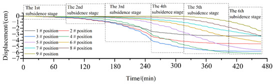 During the subsidence evolution of the soil along the pipeline route, the surrounding soil exerts axial stress on the pipeline, causing bending deformation under subsidence effects. Meanwhile, due to the reduced subsidence impact in partial areas of the mountainous terrain, localized soil provides supporting effects, leading to heterogeneous deformation patterns at different pipeline locations. Displacement values of the gas pipeline at various subsidence stages were collected via strain gauges installed on the PVC pipeline, and the variation patterns of pipeline deformation under subsidence in mountainous terrain were analyzed. The displacement curves are illustrated in Figure 7.