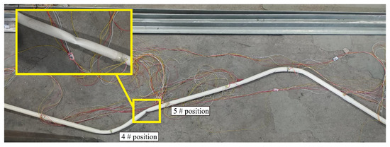 As shown in Figure 7, during the development of the subsidence basin along the pipeline route, distinct displacement trends are observed in different topographic zones. The maximum displacement occurs at positions 3 #~5 # within the central valley of the subsidence basin. Specifically, position 4 #, located at the valley-bottom, experiences the highest displacement (6.5 cm) due to increased pressure from the inclined slopes on both sides converging toward the valley. Positions 2 # and 6 #, situated on the valley’s flanking slopes, exhibit a final displacement of 4 cm. The minimal displacement (2 cm) is observed at the right edge of the subsidence basin, attributed to reduced subsidence in the later mining stages caused by goaf compaction. Post-test disassembly of the PVC pipeline revealed significant bending deformation between positions 4 # and 5 #, as illustrated in Figure 8.