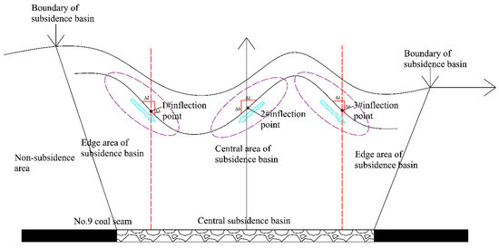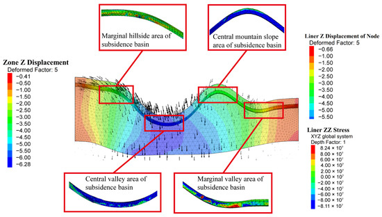 - Subsidence Manifestation Stage: Fractures penetrate upward to the valley-bottom at the surface, making subsidence effects apparent. As the working face advances, fractures propagate laterally toward both mountain slopes. Rock strata in the goaf incline toward the subsidence center, with gradual compaction occurring near the mining line. Displacements in the central strata of the subsidence basin increase significantly.