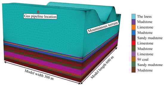 Based on the similarity simulation experiments of pipe–soil interaction under subsidence effects, it is demonstrated that failure locations of gas pipelines in mountainous terrain predominantly occur in the valley regions of collapse-induced subsidence basins. To quantitatively analyze the stress distribution in the pipeline, a surface soil damage and failure model was established using FLAC3D 9.0, incorporating the geological conditions of the Mugua Coal Mine. This model investigates the failure characteristics of surface soil and the stress–deformation behavior of the gas pipeline under mining-induced impacts. The model dimensions are 600 m in length, 300 m in width, with the upper surface simulating mountainous terrain. The mining face length is 200 m, and the total mining distance reaches 500 m. The Mohr–Coulomb constitutive model was adopted to simulate the coal-bearing strata. Horizontal constraints were applied to the four-side boundaries, and vertical displacement was restricted at the lower boundary. Based on the engineering geological conditions, the pipeline burial area primarily consists of loess with no distinct horizontal bedding, exhibiting near-homogeneous properties in its natural state. Consequently, the soil is modeled as an ideal elastoplastic material obeying the Mohr–Coulomb yield criterion [35], with soil stratification effects neglected. The gas pipeline is constructed using liner structures capable of absorbing uneven soil deformations, thereby reducing sensitivity to soil model accuracy. The overall configuration of the model is illustrated in Figure 10.