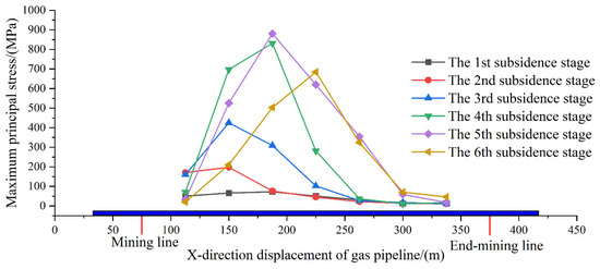 The stress characteristics of the pipeline during the advancement of the mining face were analyzed, revealing the mechanical response patterns of the pipeline under progressive mining. The calculated maximum principal stress of the pipeline during the development of the subsidence basin is illustrated in Figure 12.