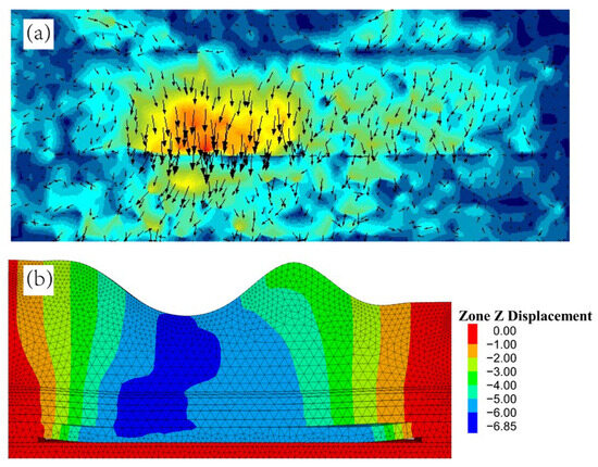 Comparison of the deformation results between the similar test and numerical simulation. (a) similar simulation test; (b) numerical simulation.