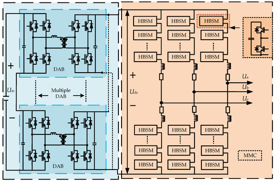 Figure 1 shows the DAB and MMC topologies. HBSM stands for half bridge submodule, and Udc is the MMC’s DC input voltage. Ua, Ub, and Uc are the AC voltages of phases A, B, and C, respectively, which are output by the MMC.