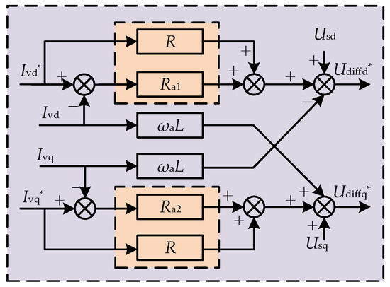 where Ivd and Ivq are the bridge arm currents of the dq axis, respectively; Usd and Usq are the grid-side voltages of the dq axis, respectively; Udiffd and Udiffq are the differential mode voltages of the dq axis, respectively; ωa is the grid fundamental angular frequency; s is a differential operator; L = L0/2 + Lg; and R = R0/2 + Rg.
