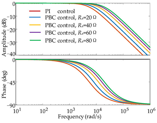 Based on Figure 5, PBC control has a higher cut-off frequency compared to traditional PI control, and the bandwidth of the current loop is also larger. The PBC control system’s signal-tracking ability is stronger, and its response speed is faster. Furthermore, as the injection resistance increases, the system’s cut-off frequency increases, but the system’s anti-interference ability will weaken.