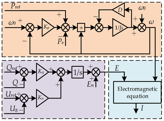 The virtual voltage controlled by a VSG consists of three parts. The first part is the no-load electromotive force En of the VSG; the second part is the VSG reactive power regulation section ΔEQ; and the third part is the VSG terminal voltage regulation section ΔEV. By simultaneously introducing an integral excitation regulator, we can obtain the expression for reactive voltage control.