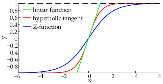 Figure 8 shows the graphs of the hyperbolic tangent function, Z-function, and linear function. Compared with the other two functions, the sigmoid function has a smoother rate of change and also possesses an amplitude-limiting function. This can prevent parameter changes from being too large or too fast, thereby improving the system’s dynamic performance. Among them, the Z function is defined as twice the sigmoid (x), minus 1.