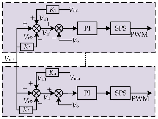 To address this problem, this paper uses a decentralized approach to control the voltage balance at the input port of an ISOP-type DAB. The control principle is as follows. First, the average input voltage of the DAB converter, denoted as Vin, is introduced. Then, a proportional function is applied to Vin to obtain a corrected value Vrf1 based on the given reference output voltage Vref of the DAB converter. At this time, there is a slight difference between Vref and Vrf1. To reduce this error, a correction coefficient is introduced. The correction coefficient is multiplied by Vref to obtain a further corrected value Vrf2, which aims to minimize the deviation of Vrf from Vref. The Vrf is then compared with the actual value of the output voltage Vo. The resulting error signal is fed into a PI controller, which generates a phase shift modulation value. This phase shift modulation value is then used to obtain the PWM wave through a Single-Phase Shift (SPS) modulation process, and finally, the output voltage control is achieved. The control topology is shown in Figure 10.