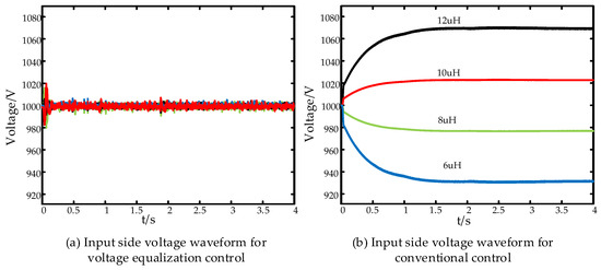 To verify the effectiveness of the ISOP-DAB input voltage equalization control strategy, the inductance values of the four DAB converters are set to 12 µH, 10 µH, 8 µH, and 6 µH, respectively, and the input voltage is set to 4000 V. Figure 11 shows the voltage waveforms of the DAB inputs with different inductance parameters.