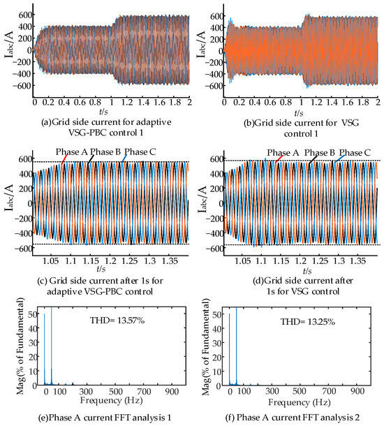 Grid-side current under power variations: (a) grid-side current for adaptive VSG-PBC control 1; (b) grid-side current for VSG control 1; (c) grid-side current after 1 s for adaptive VSG-PBC control; (d) grid-side current after 1 s for VSG control; (e) phase A current FFT analysis 1; and (f) phase A current FFT analysis 2.