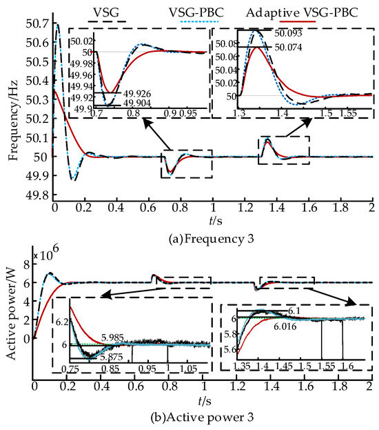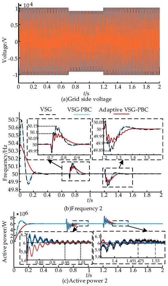 Based on Figure 12, it is evident that the system frequency stabilizes at 0.3 s when utilizing PBC during startup. In contrast, traditional VSG control takes 0.47 s to reach stability. At 1 s, the output active power of the MMC system abruptly increases from 6 MW to 8.5 MW. Under PBC control, stability is achieved at 1.26 s, whereas traditional VSG control requires 1.39 s to stabilize. The maximum frequency peak is 50.167 Hz with adaptive VSG-PBC control compared to 50.292 Hz without adaptive control. In terms of power performance, the adaptive VSG-PBC control has almost no power overshoot due to adaptive change in the parameters of J and D compared to the maximum power overshoot of 8.87 MW with conventional VSG control.