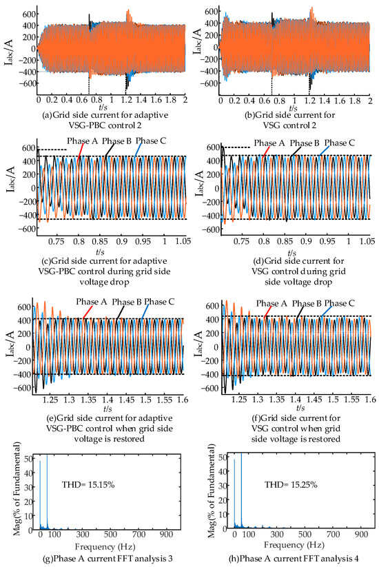 As shown in Figure 15d, when the grid-side voltage changes, the peak grid-side current reaches 589 A with the conventional VSG control, while the peak grid-side current reaches 576 A with the adaptive VSG-PBC control, as shown in Figure 15c. In addition, based on Figure 15d,f, it can be concluded that the traditional VSG control current inner loop is a PI control, and when the grid-side voltage changes abruptly, the current performance is degraded due to the fixed value of its PI, which cannot be automatically coordinated with the changing system. In Figure 15c,e, it can be seen that the adaptive VSG-PBC control introduces PBC control under the working condition of grid-side voltage variation, and the control performance of the current remains stable as long as the passive condition is still satisfied. Figure 15g shows the FFT analysis of conventional VSG power control of the A-phase current. Figure 15h shows the FFT analysis of the adaptive VSG-PBC power control of the A-phase current. The THD value of the A-phase current is larger throughout the time period due to the variation in the grid-side voltage magnitude, but it can be seen that the THD value of the current is smaller and the system is more stable for the adaptive VSG-PBC power control.