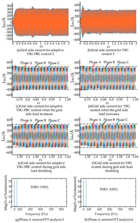 Grid-side current under grid-side load changes: (a) grid-side current for adaptive VSG-PBC control 3; (b) grid-side current for VSG control 3; (c) grid-side current for adaptive VSG-PBC control when the grid-side load increases; (d) grid-side current for VSG control when the grid-side load increases; (e) grid-side current for adaptive VSG-PBC control during grid-side load shedding; (f) grid-side current for VSG control during grid-side load shedding; (g) phase A current FFT analysis 5; and (h) phase A current FFT analysis 6.