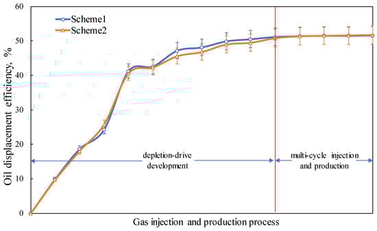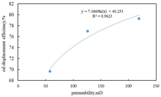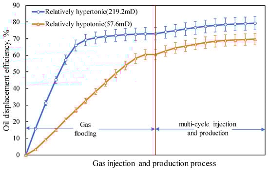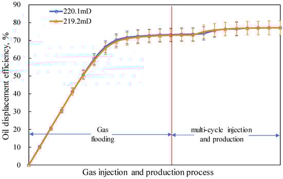 - Parallel double-tube long-core displacement experiments demonstrate that when the permeability is the same, the oil displacement efficiencies during the gas flooding stage and the cyclic injection–production stage are essentially identical. When there exists a permeability contrast, the oil displacement efficiency of the high-permeability core is 9.56% higher than that of the low-permeability core. The ratio of the oil displacement efficiency between the high-permeability end and the low-permeability end is positively correlated with the permeability contrast; the greater the permeability contrast, the larger the ratio.