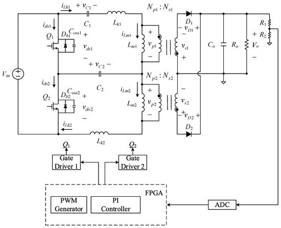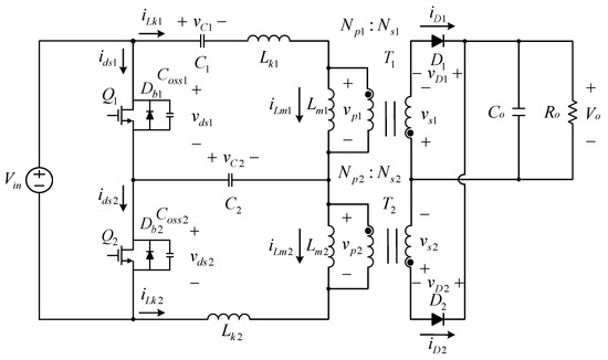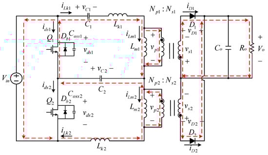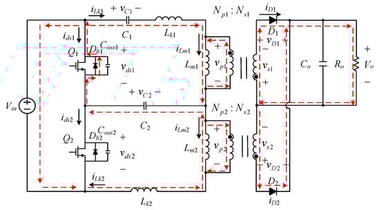 - vp1 and vp2 are the primary-side voltages of the first transformer and the second transformer, respectively; vs1 and vs2 are the secondary-side voltages of the first transformer and the second transformer, respectively.